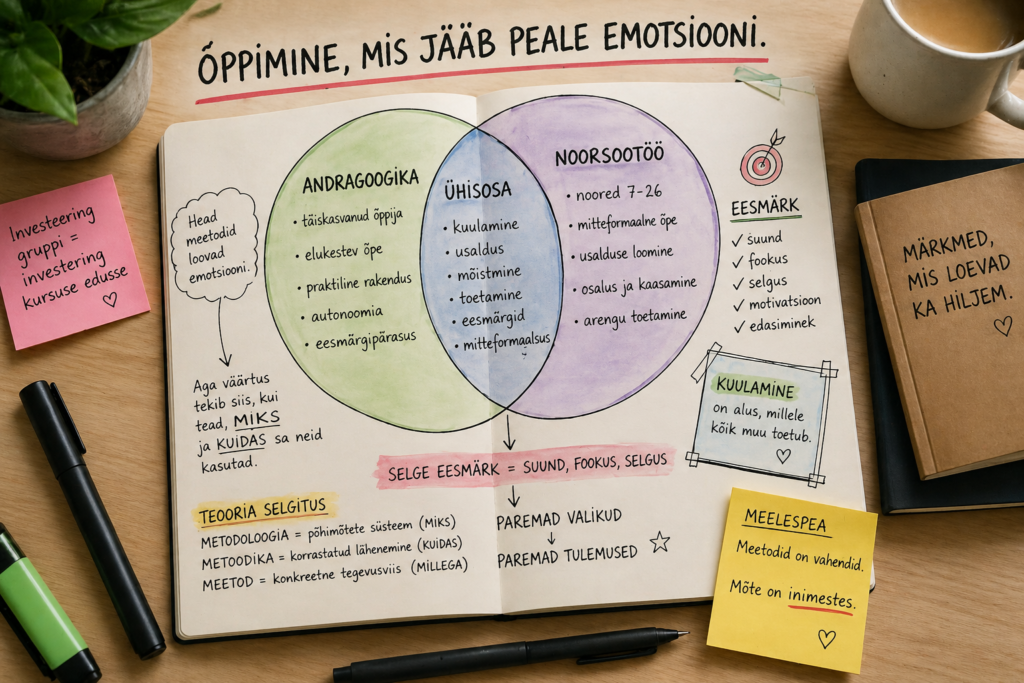 Kuna tähemärgid on piiratud, siis võtan esimese õppekohtumise nädala kokku järgnevalt. Kursuse teoreetilisest osast jäi mulle eriti meelde metodoloogia, metoodika ja meetodi eristamine – metodoloogia on laiem põhimõtete süsteem, millest lähtutakse, metoodika kirjeldab, kuidas tegevust üles ehitatakse, ning meetod on konkreetne viis, kuidas eesmärgini jõuda . See pani mind mõtlema, et olen ise palju keskendunud meetoditele, kuid sama oluline on mõista ka seda, miks ja millises raamistikus neid kasutada. Samuti rõhutati eesmärgistamise olulisust – selge eesmärk aitab valida sobivaid meetodeid ja hoida tegevuse fookust .